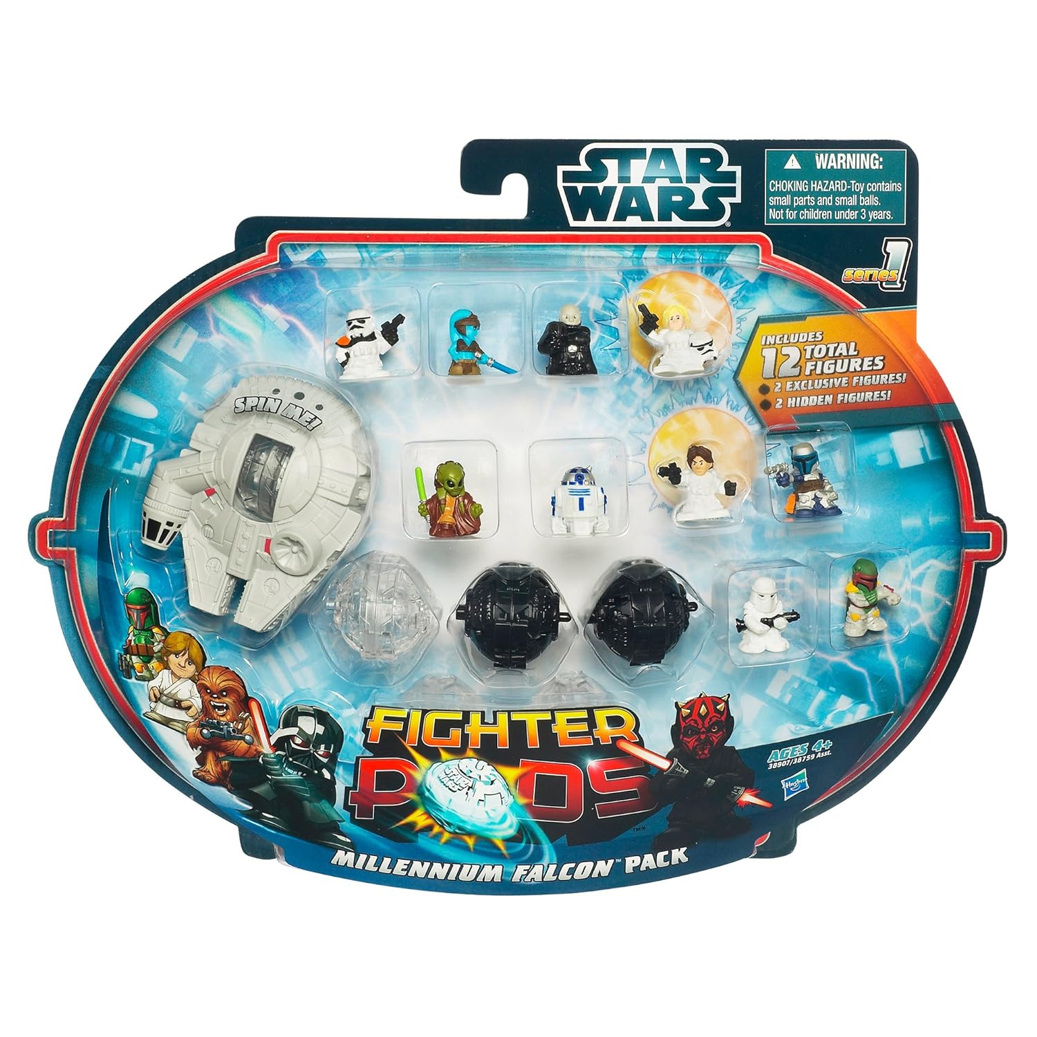 The Star Wars Fighter Pods Figure 12-Pack – Millennium Falcon Pack includes 12 total figures. 2 of the figures are exclusives while 2 are hidden figures. That means you’ll discover what they are when you open the package! One vehicle and six pods are also included.